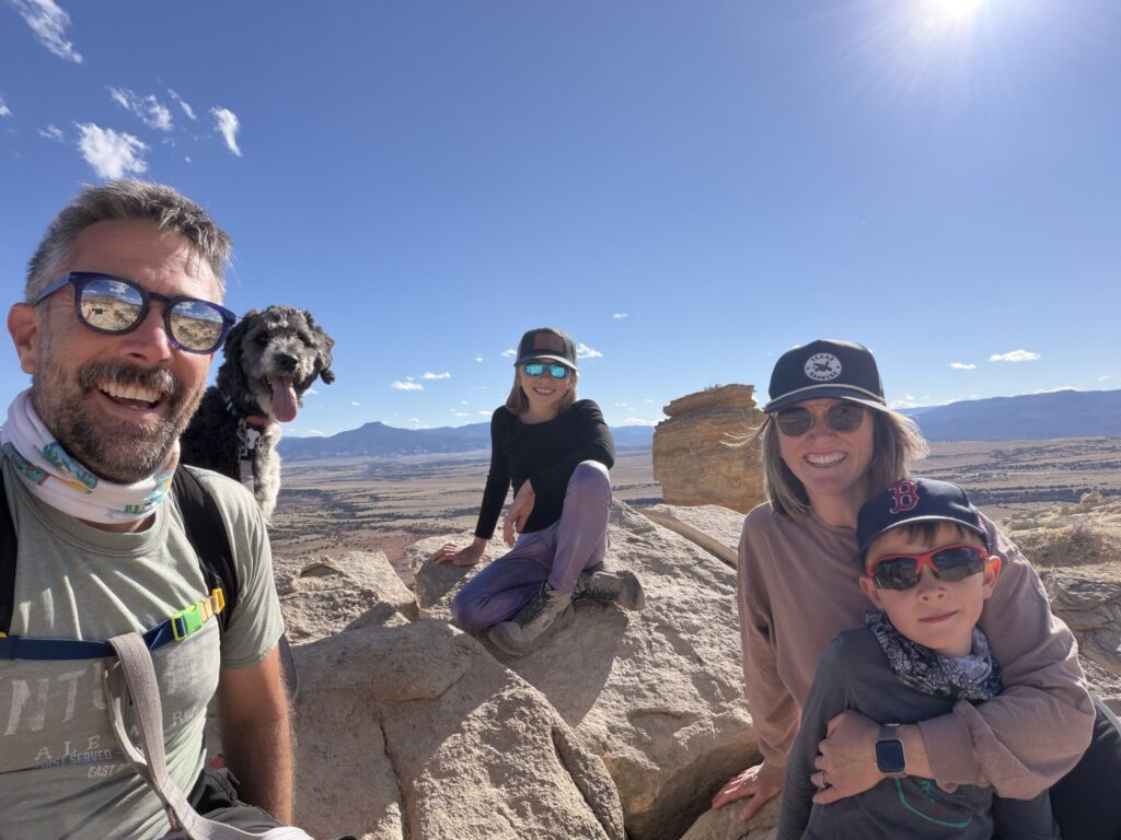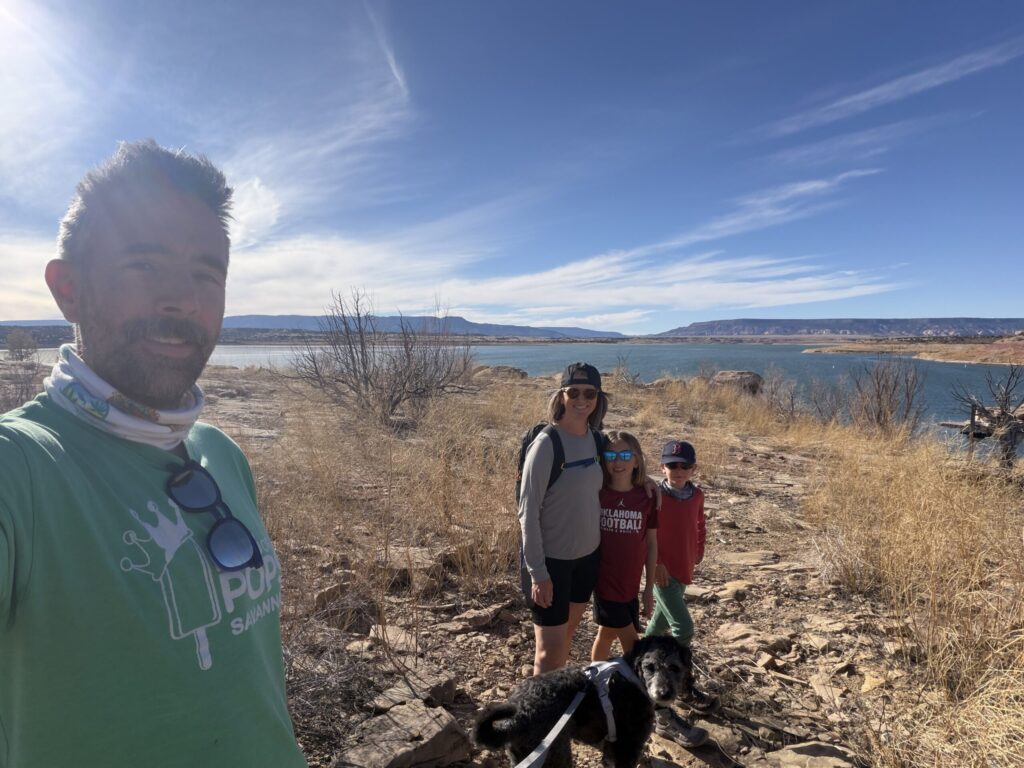 The water against the desert backdrop didn’t feel real — bright blues with red and tan cliffs all around. Hung out for a bit, skipped rocks, let the kids explore.