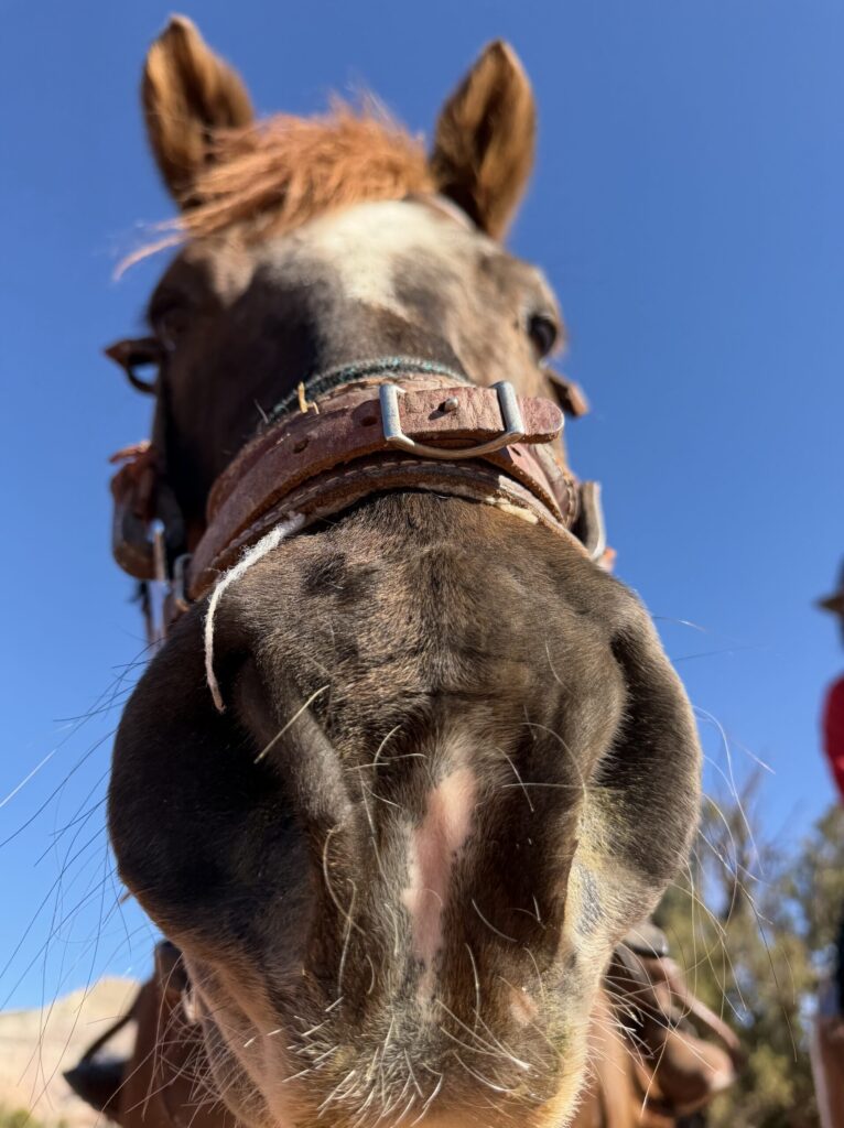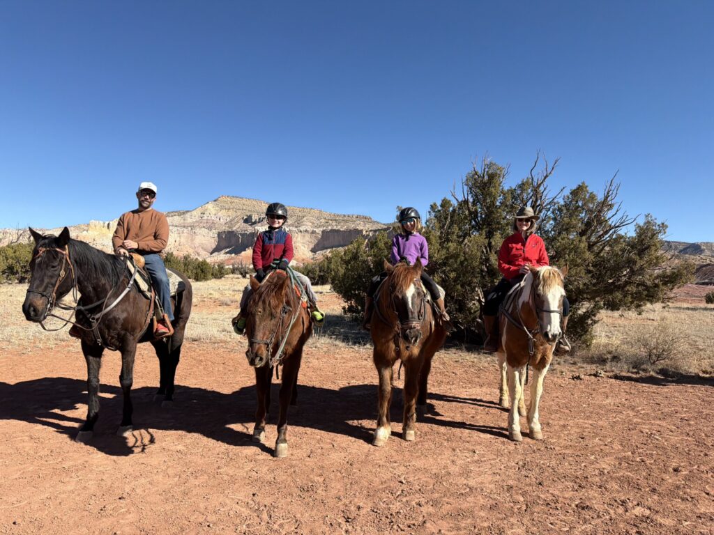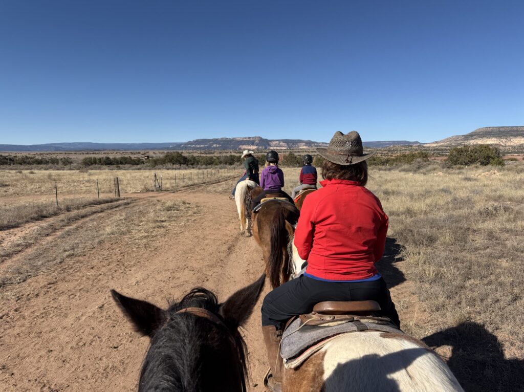 The place is massive — over 20,000 acres — and it feels even bigger when you’re out riding through it. Cal was on Tuxedo, who spent most of the ride trying to bite the horse in front. Meagan rode Pancake, Bethan was on Roy, and Jude rode Chopper.
